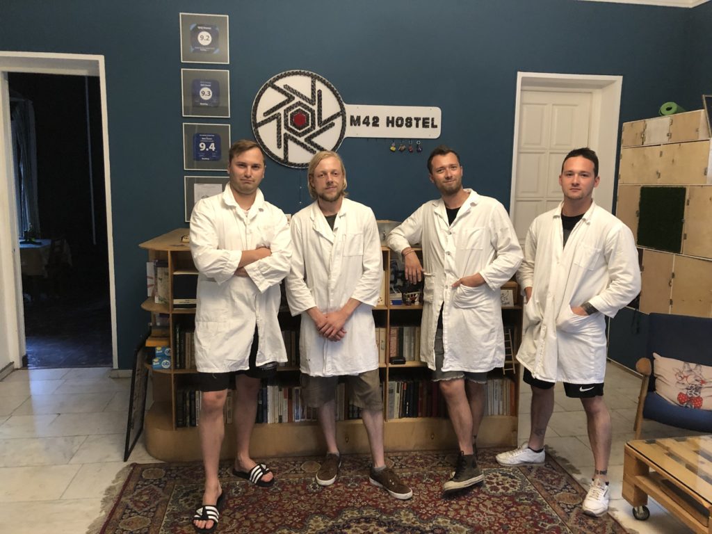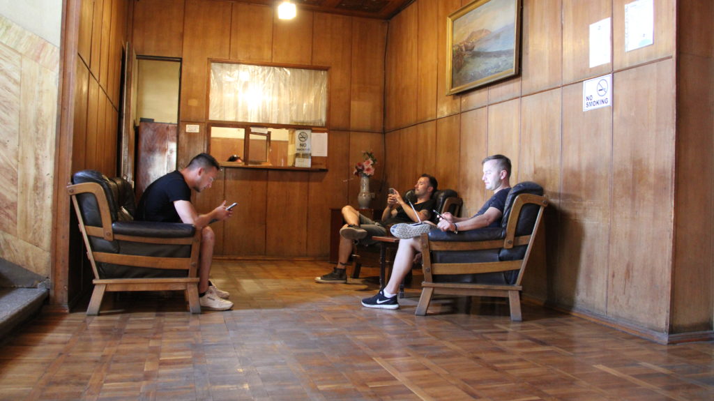 Lobby UdSSR-Style – die Jungs checken ihre Insta-Profile