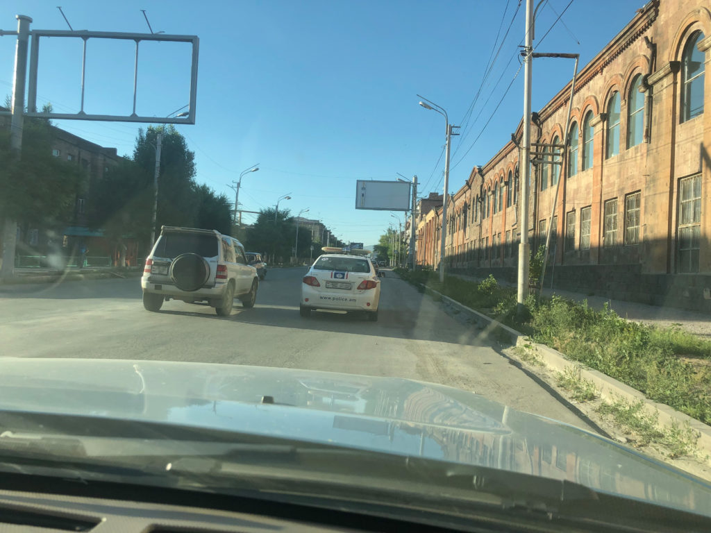 Interessant vielleicht noch zu erwähnen, dass wir in Gyumri erstaunlicherweise das erste Mal Kontakt mit der einheimischen Polizei hatten. Ein unerlaubtes Wendemanöver rief die Jungs auf dem Plan. Nachdem uns der Kollege anhand einer rasch angefertigten Handskizze unser Vergehen erklärte, mussten wir einen Strafzettel in Höhe von runde 9 Euro begleichen. Aber alles offiziell, die zwei Kollegen trugen sogar Bodycams und verhielten sich äußerst korrekt. Ich habe den Eindruck, dass man sich hier doch intensiv auf die Fahnen geschrieben hat, gegen die Korruption der Vergangenheit vorzugehen. Angenehmer Nebeneffekt: Die Cops geleiteten uns anschließend mit Blaulichteskorte zu unserem Ziel. Selbstverständlich nun nur noch mit erlaubten Wendemanövern.