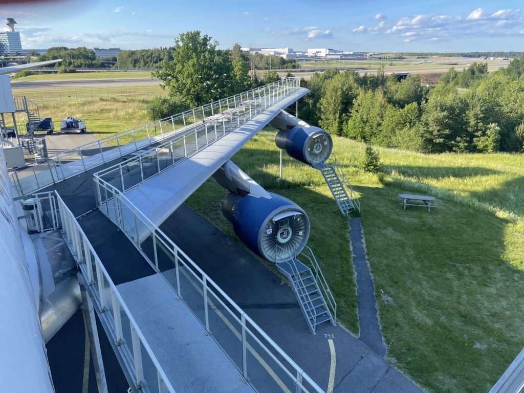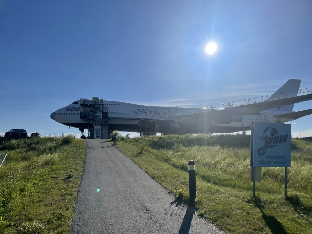 Im Nu waren wir dann auch wieder zurück in der City. Es gab ein umfangreiches Mahl bei MAX (Das ist so in etwa das schwedische McDonalds). Besonders die mit Käse überbackenen Pommes in Kombination mit Jalapeños und Zwiebeln waren sehr lobenswert. Für den Verdauungstrakt aber auch sehr gefährlich! Mit dem Arlanda Express ging es dann wieder zurück in Richtung Flughafen. Das letzte große Highlight dieser Reise stand an. Bis zum Rückflug nach Berlin hatten wir zwar noch eine Übernachtung, aber genau diese Übernachtung sollte es in sich haben! Wir übernachteten im Jumbo Stay Stockholm. Eine ausgemusterte Boeing 747 (747-212B, Baujahr 1976) wurde hier zum Hostel umgebaut und lädt Gäste aus aller Welt ein. Da es sich aufgrund des Geburtstags von Schwester Lori sowieso um einen besonderen Tag handelte, sollte auch die Nachtruhe eine ganz besondere sein. Wir hatten die höchste und einmalige Zimmerkategorie gebucht: Die Cockpit Suite. Hier einige Impressionen der Unterkunft. Es hat sich echt gelohnt!