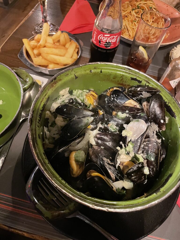 Mit der Metro ging es zurück ins Hotel und wir machten uns für das Abendessen frisch. Nachdem es am Vortag Italienisch gab, sollte es heute mal typisch belgisch geben. Wir kehrten im Le Bistro ein. Für Sr. Lori gab es das typisch belgische Gericht Spaghetti Bolognese. Ich wiederum hatte mich für einen Topf mit 1kg Miesmuscheln entschieden. Die Muscheln wechselhaft mit Fingern und Gabel zu essen war schnell eingespielt und somit konnten wir auch dieses Must-Do in Brüssel abhaken.