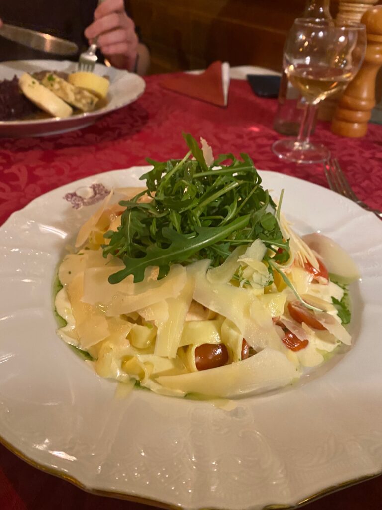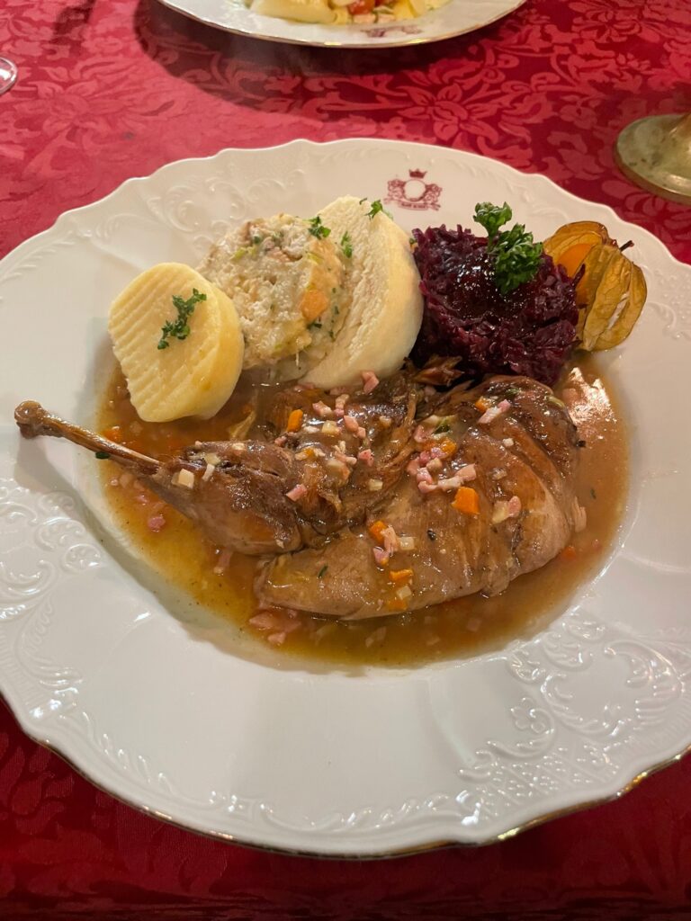 Ab Nachmittag wendeten wir uns dann dem eigentlichen Ziel des Urlaubs zu: Wellness. Bademäntel und co war im Zimmer inbegriffen. Leider vergaßen wir daheim unsere Badelatschen und somit mussten wir auf die Einweg-Slipper ausweichen. Ging schon klar, aber war auch eine äußerst rutschige Angelegenheit – bisher keine Verletzungen! Anwendungen gab es am Freitag eine Gesichtsmassage für Sr. Lori und eine Torfpackung für mich. Whirlpool und Sauna rundeten den Tag ab. Am Abend fanden wir uns im Restaurant U Zlaté Koule wieder. Service einwandfrei und das Essen ließ sehr zu gefallen. Im Hauptgang hatte ich mich für einen halben Fasan entschieden, Sr. Lori wählte Nudeln mit Lachs. Wir wurden beiden nicht enttäuscht. Verhältnismäßig ist es aber auch relativ hochpreisig!