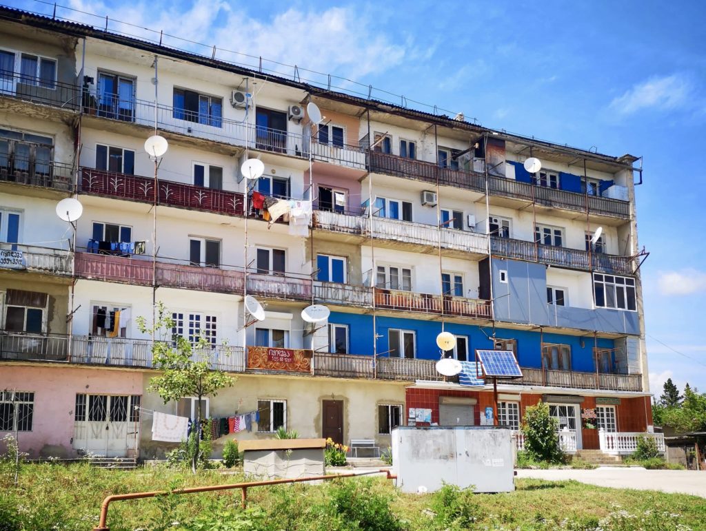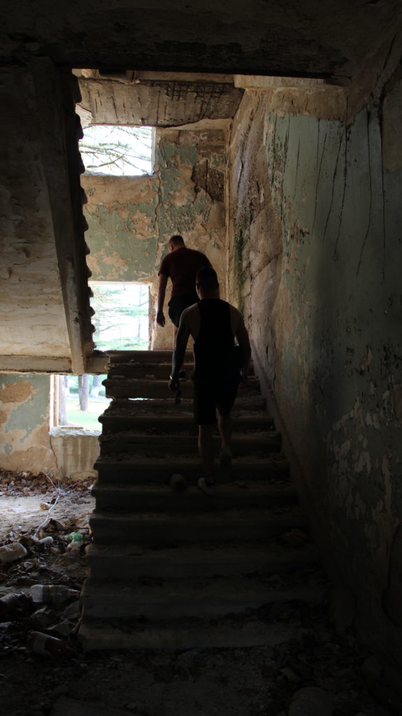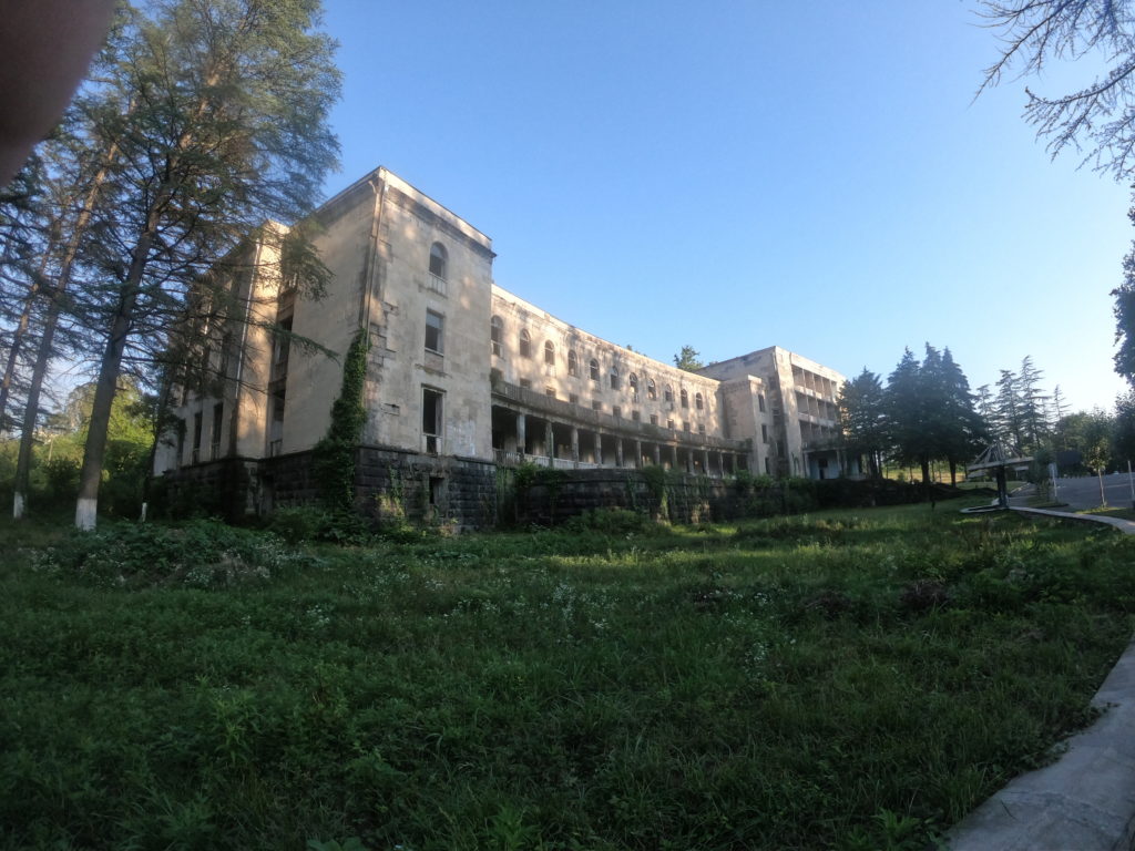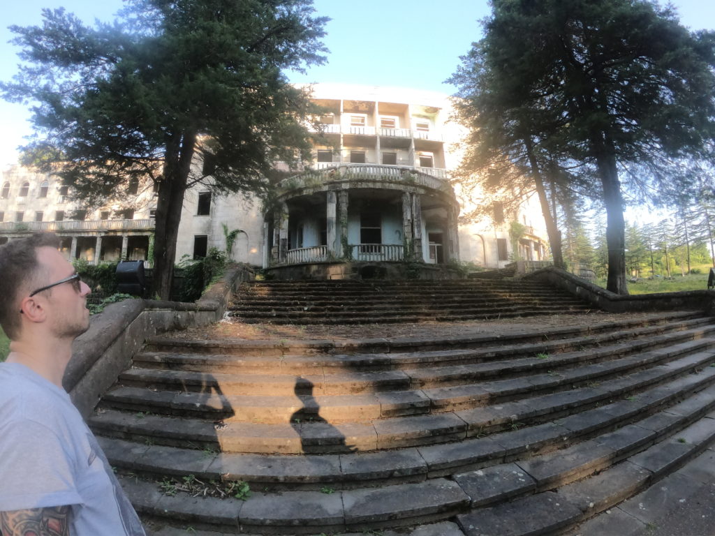 Nach dem Mahl entspannten wir noch eine ganze Weile direkt am See. Wieder auf dem Weg in Richtung Kutaissi hielten wir nun jedoch auch nochmal an den fragwürdigen Gebäuden an. Tskaltubo hat ein bisschen den Flair einer Geisterstadt und Freunde von sogenannten „Lost Places“ können hier so einiges erleben. Auch wir rätselten viel, um was für Gebäude es sich handelt. Eine spätere Recherche ergab, dass der Ort früher ein bedeutender Kurort war. Nach Zusammenbruch der UdSSR verfielen aber alle diese Prunkbauten. Wir traten eine Begehung des Hotels „Sanatorium“ an