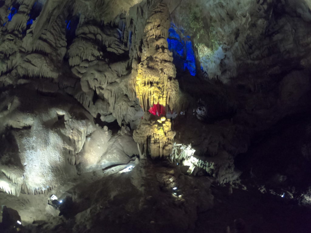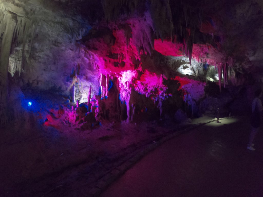 Gestärkt ging es dann weiter in Richtung Höhle, die Prometheus Cave nördlich von Tskaltubo. Der Ort Tskaltubo selber weckte bereits auf der ersten Durchfahrt unser Interesse und wir bestaunten die zahlreichen Bauwerke aus der sozialistischen Ära. Zunächst sollte es aber in die Höhle gehen. Wir erwarben unser Besucherticket für 23 GEL (GEL = Georgischer Lari, 3 GEL = 1 Euro), was verhältnismäßig relativ teuer war. In einem zukünftigen Eintrag möchte ich gerne auf Preise allgemein hier im Land eingehen. Auf dem 45-minütigen Rundgang durch die Höhle betrachteten wir Stalagmiten und Stalaktiten und schossen zahlreiche Erinnerungsfotos.